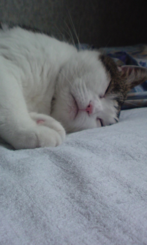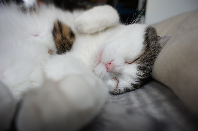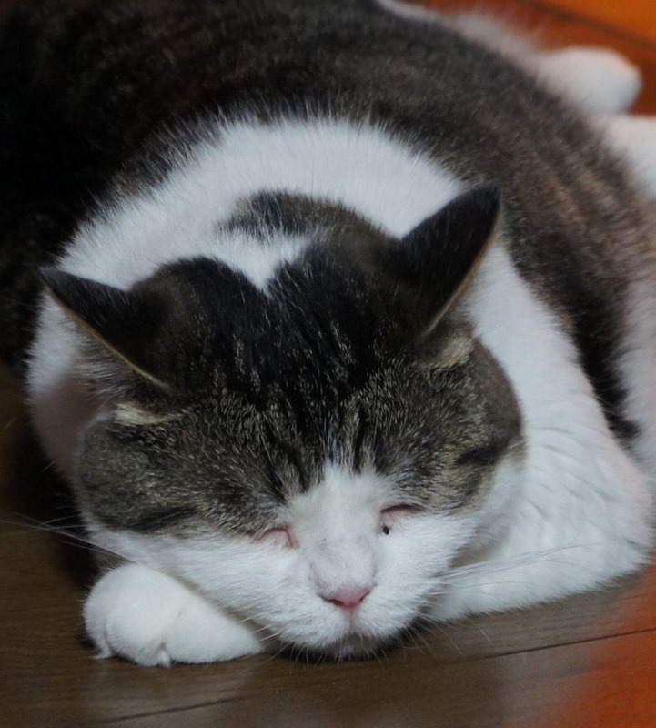 特徴:足が短い。鼻の頭がもこっとしている。モンペをはいているかのような後ろ足である。大また開きで寝る。時折DVになる。ピンポン♪が鳴ると(来客)ダッシュで飛び出し、お迎え役をしつつ、脱走の隙を狙う。