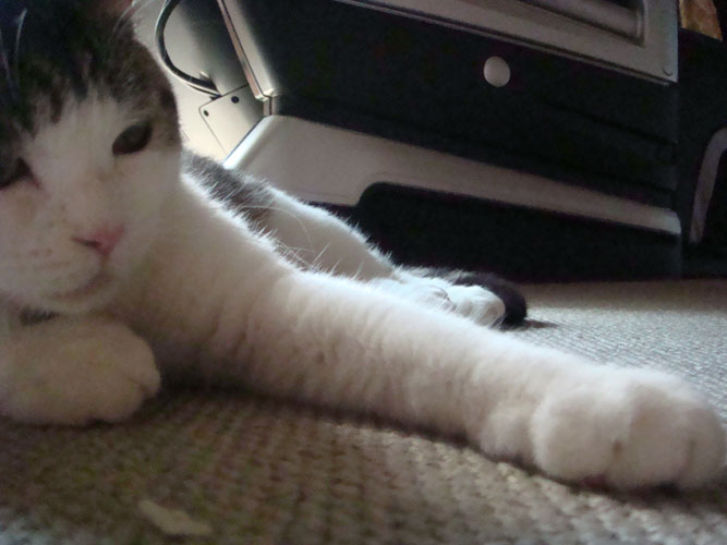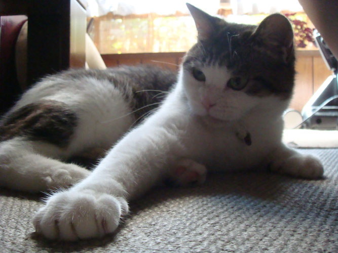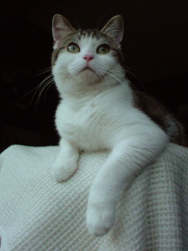 特徴:足が短い。鼻の頭がもこっとしている。モンペをはいているかのような後ろ足である。大また開きで寝る。時折DVになる。ピンポン♪が鳴ると(来客)ダッシュで飛び出し、お迎え役をしつつ、脱走の隙を狙う。
