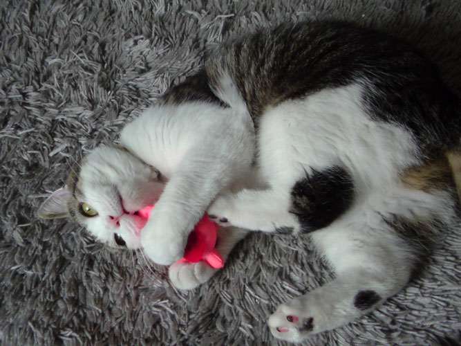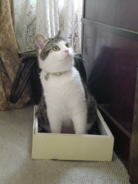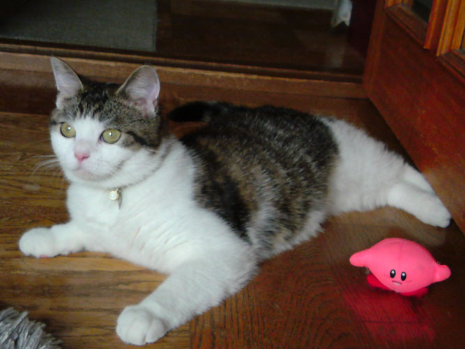 特徴:足が短い。鼻の頭がもこっとしている。モンペをはいているかのような後ろ足である。大また開きで寝る。時折DVになる。ピンポン♪が鳴ると(来客)ダッシュで飛び出し、お迎え役をしつつ、脱走の隙を狙う。