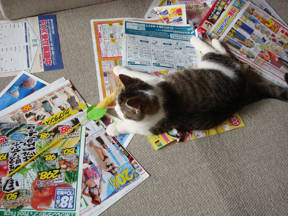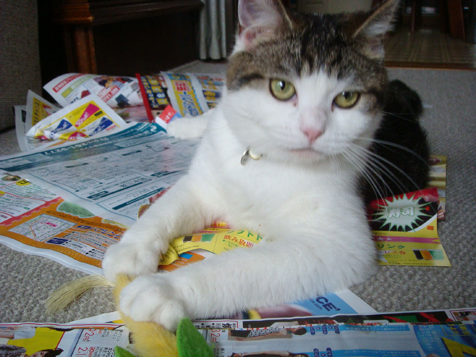 よしよし、寝転がってもいいからね、君の体で隠れていない記事を読むよ~