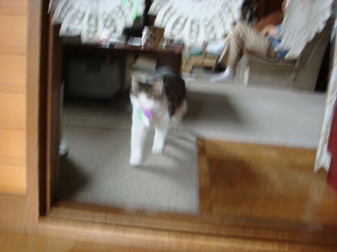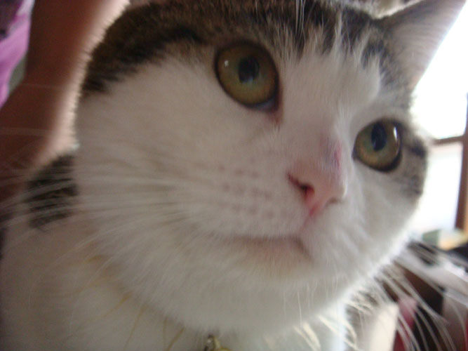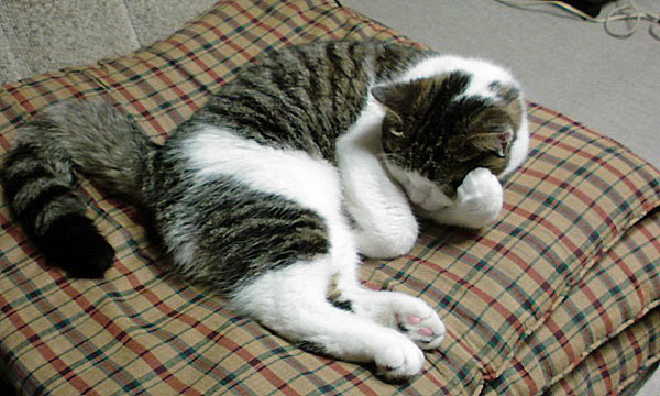 特徴:足が短い。鼻の頭がもこっとしている。モンペをはいているかのような後ろ足である。大また開きで寝る。時折DVになる。ピンポン♪が鳴ると(来客)ダッシュで飛び出し、お迎え役をしつつ、脱走の隙を狙う。