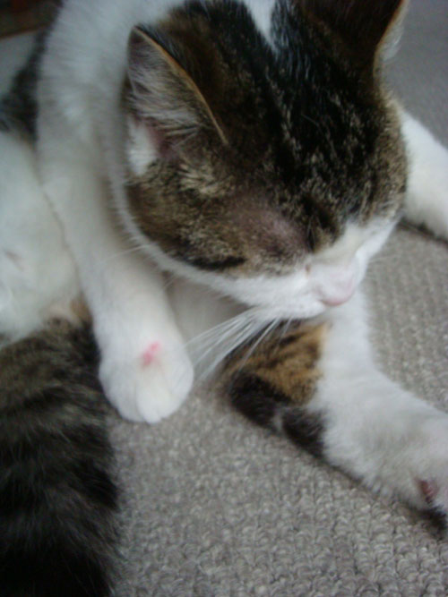 ところで今朝のこと。桂の前足に赤い斑点が。