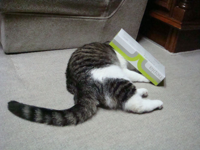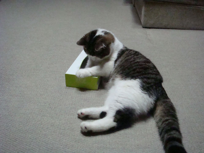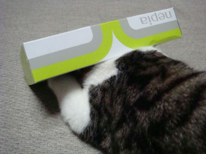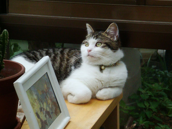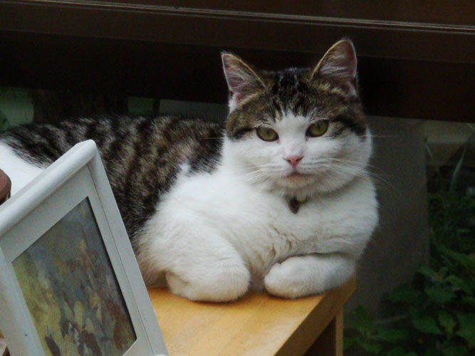 特徴:足が短い。鼻の頭がもこっとしている。モンペをはいているかのような後ろ足である。大また開きで寝る。時折DVになる。ピンポン♪が鳴ると(来客)ダッシュで飛び出し、お迎え役をしつつ、脱走の隙を狙う。