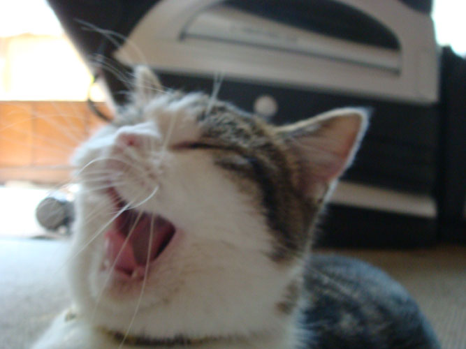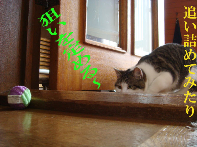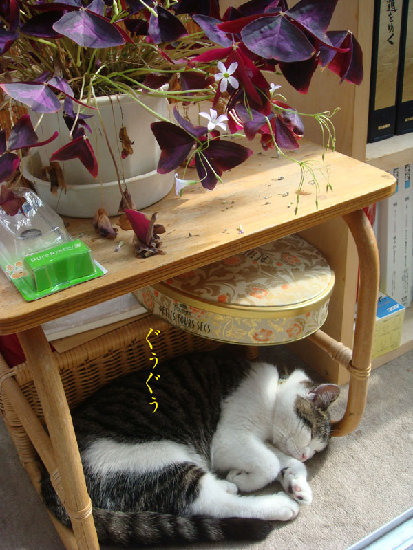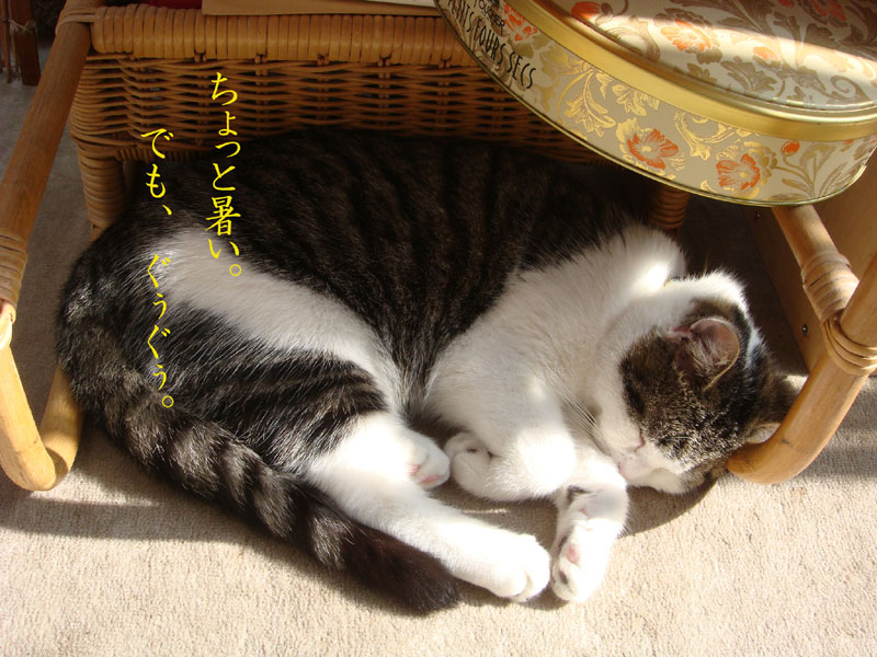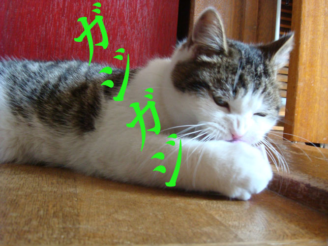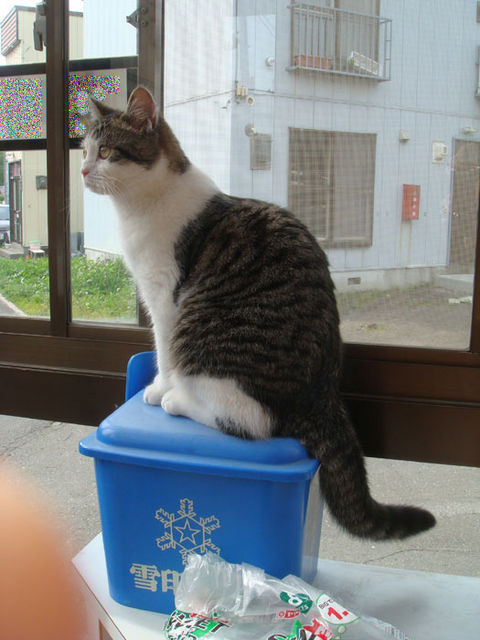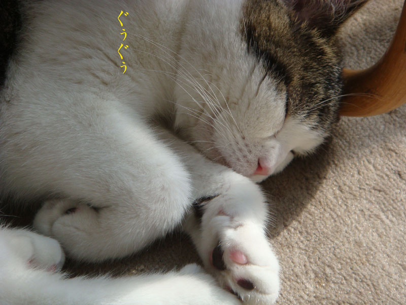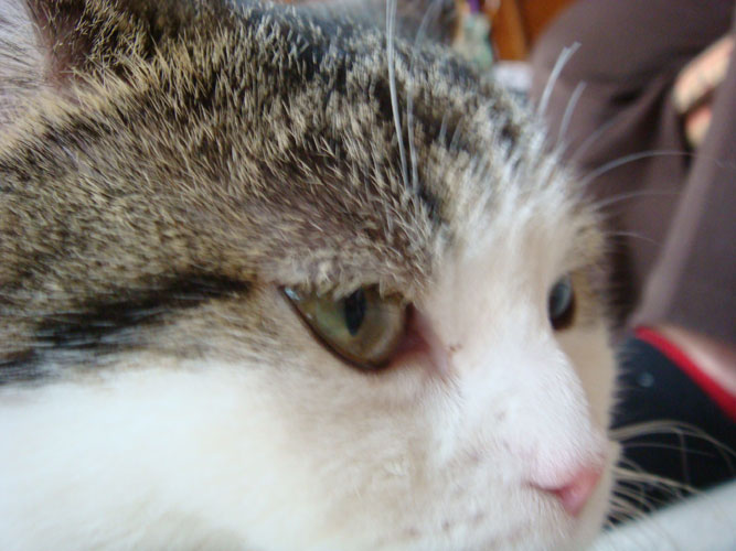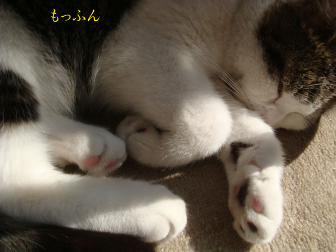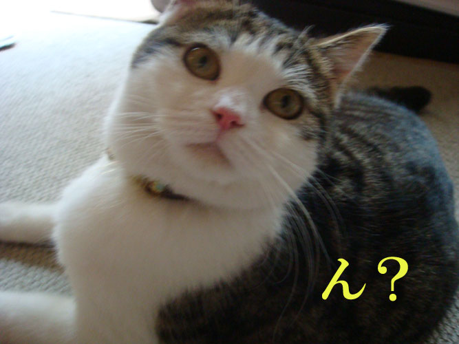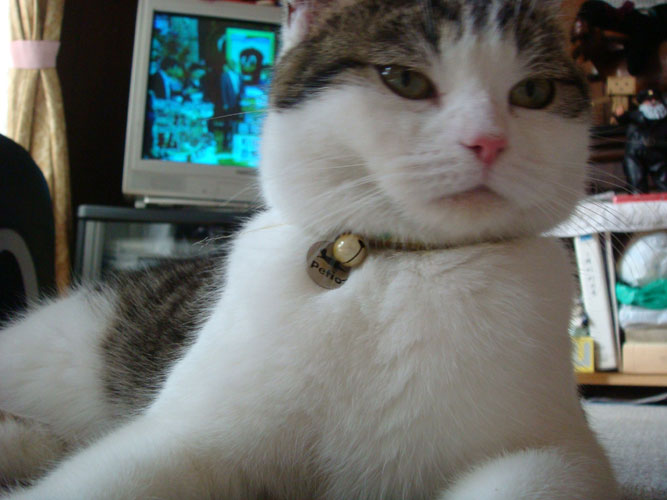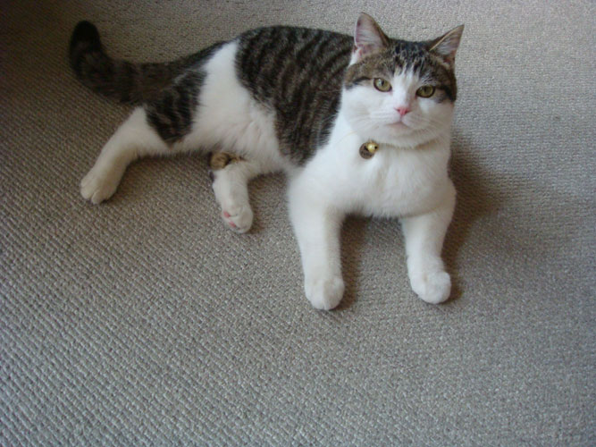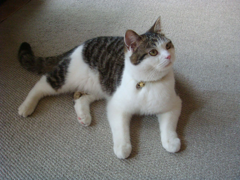 特徴:足が短い。鼻の頭がもこっとしている。モンペをはいているかのような後ろ足である。大また開きで寝る。時折DVになる。ピンポン♪が鳴ると(来客)ダッシュで飛び出し、お迎え役をしつつ、脱走の隙を狙う。
