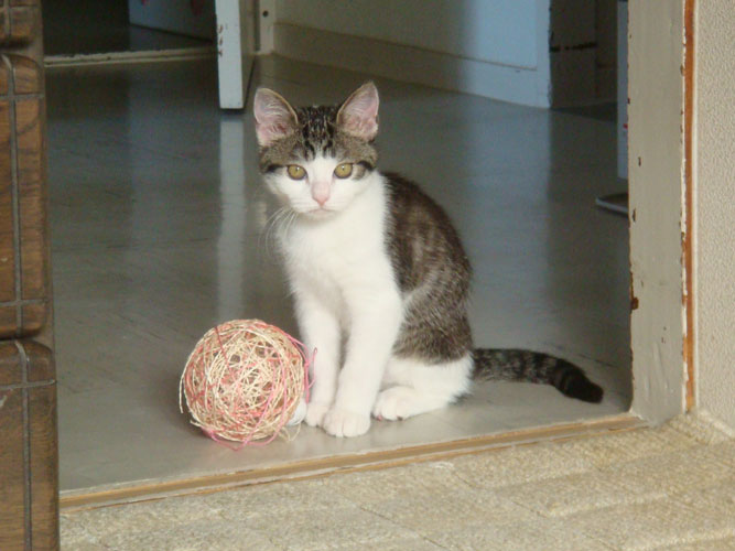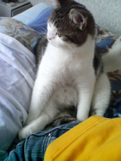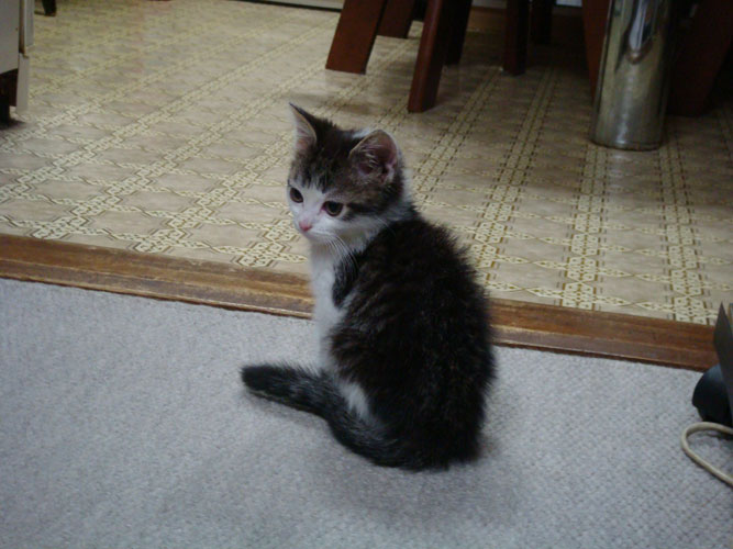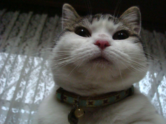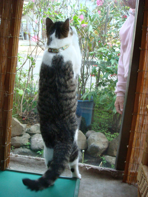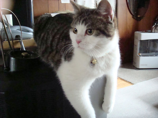特徴:足が短い。鼻の頭がもこっとしている。モンペをはいているかのような後ろ足である。大また開きで寝る。時折DVになる。ピンポン♪が鳴ると(来客)ダッシュで飛び出し、お迎え役をしつつ、脱走の隙を狙う。