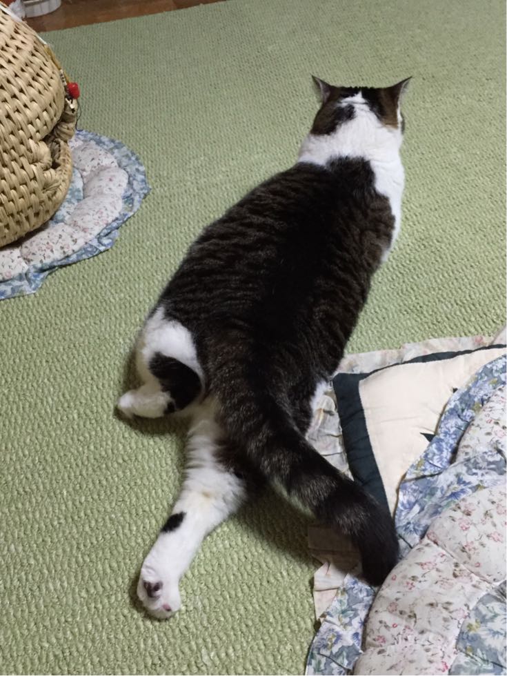 特徴:足が短い。鼻の頭がもこっとしている。モンペをはいているかのような後ろ足である。大また開きで寝る。時折DVになる。ピンポン♪が鳴ると(来客)ダッシュで飛び出し、お迎え役をしつつ、脱走の隙を狙う。