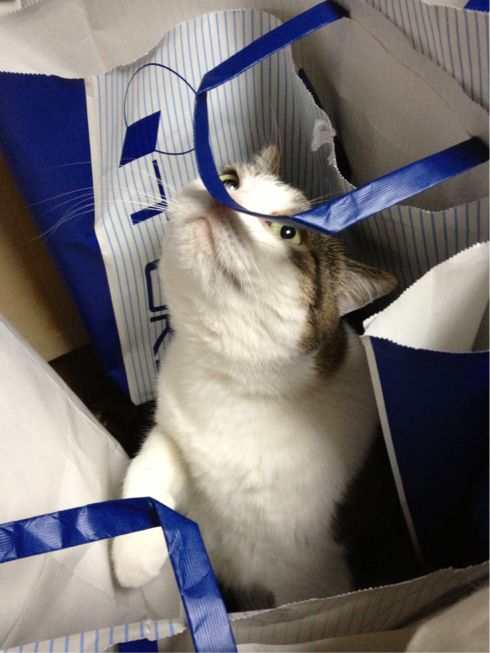 大好きな紙袋がびっしり入った段ボール箱は、