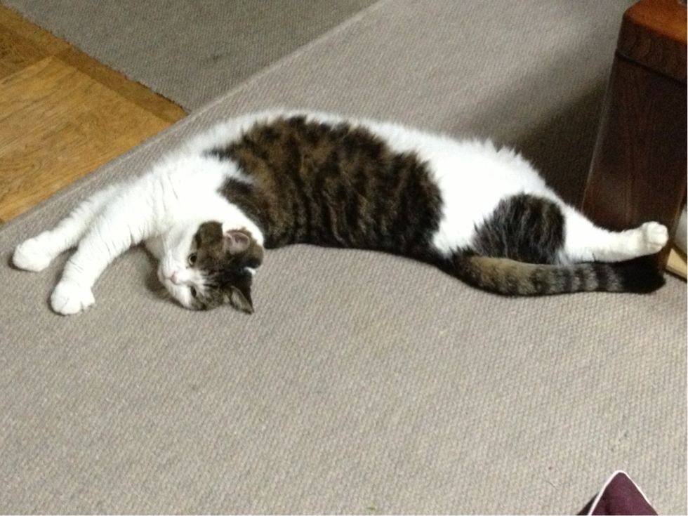 特徴:足が短い。鼻の頭がもこっとしている。モンペをはいているかのような後ろ足である。大また開きで寝る。時折DVになる。ピンポン♪が鳴ると(来客)ダッシュで飛び出し、お迎え役をしつつ、脱走の隙を狙う。