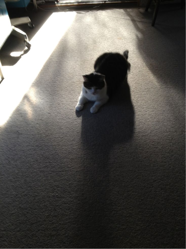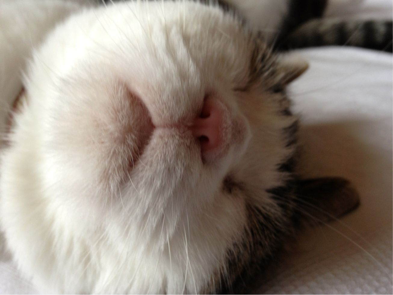 特徴:足が短い。鼻の頭がもこっとしている。モンペをはいているかのような後ろ足である。大また開きで寝る。時折DVになる。ピンポン♪が鳴ると(来客)ダッシュで飛び出し、お迎え役をしつつ、脱走の隙を狙う。
