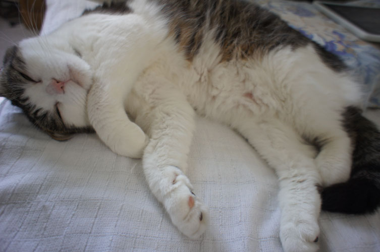 特徴:足が短い。鼻の頭がもこっとしている。モンペをはいているかのような後ろ足である。大また開きで寝る。時折DVになる。ピンポン♪が鳴ると(来客)ダッシュで飛び出し、お迎え役をしつつ、脱走の隙を狙う。
