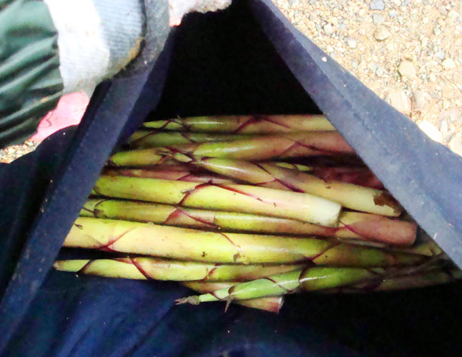でも採った山菜を入れる前掛けや、長靴、ほおかむりしたタオルは必需です。