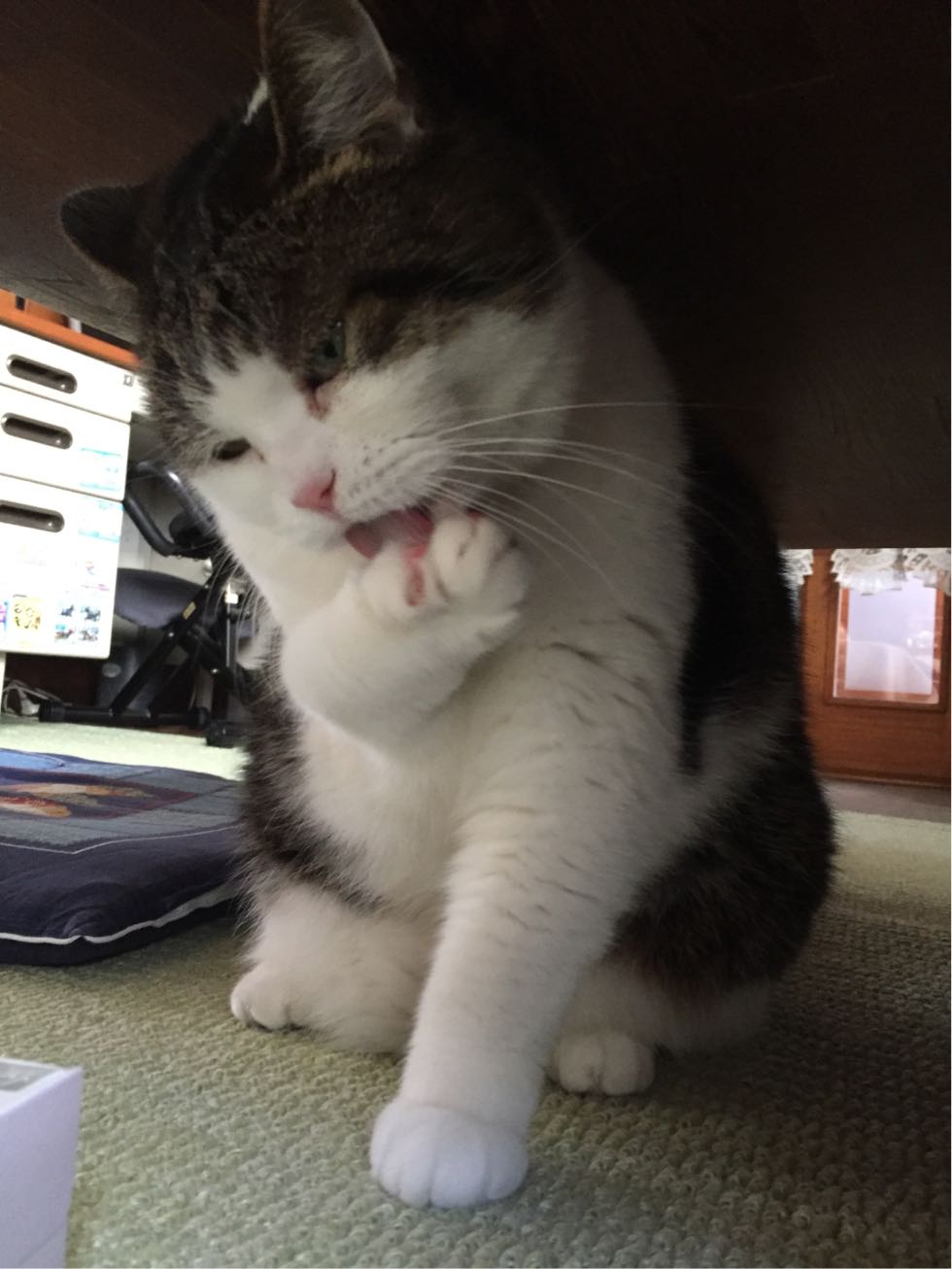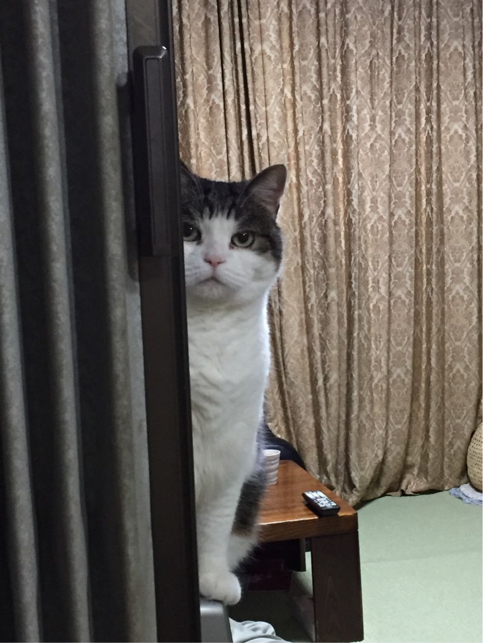 特徴:足が短い。鼻の頭がもこっとしている。モンペをはいているかのような後ろ足である。大また開きで寝る。時折DVになる。ピンポン♪が鳴ると(来客)ダッシュで飛び出し、お迎え役をしつつ、脱走の隙を狙う。