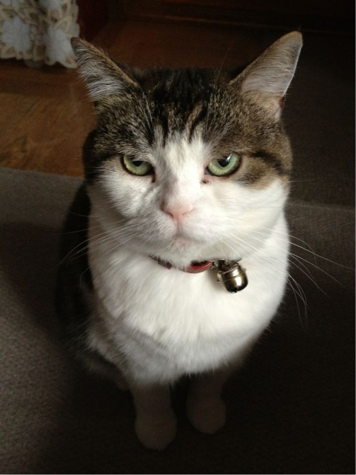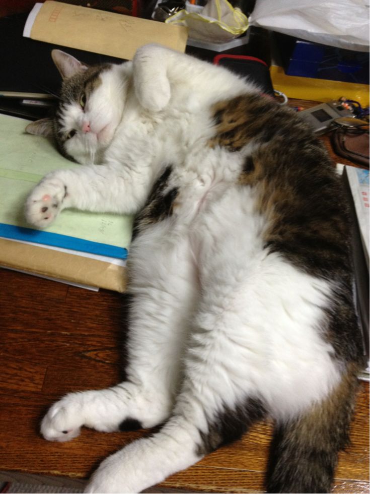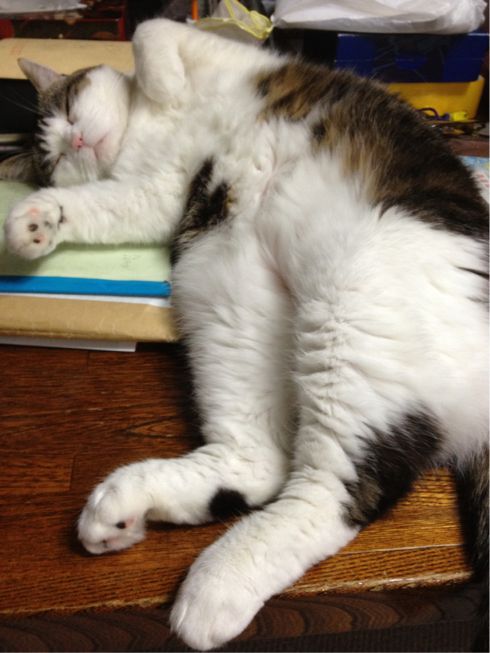 特徴:足が短い。鼻の頭がもこっとしている。モンペをはいているかのような後ろ足である。大また開きで寝る。時折DVになる。ピンポン♪が鳴ると(来客)ダッシュで飛び出し、お迎え役をしつつ、脱走の隙を狙う。