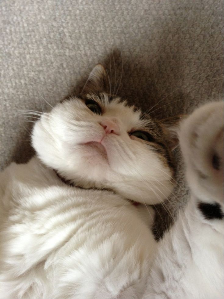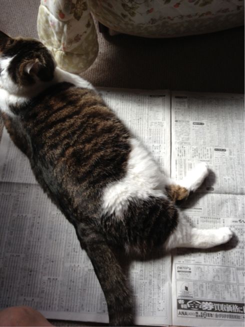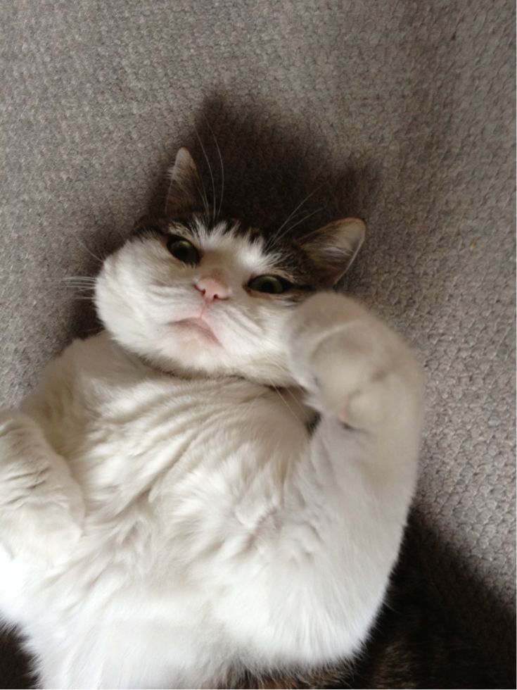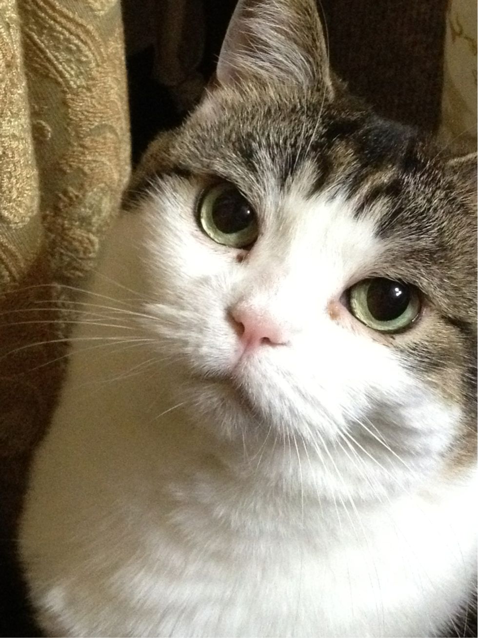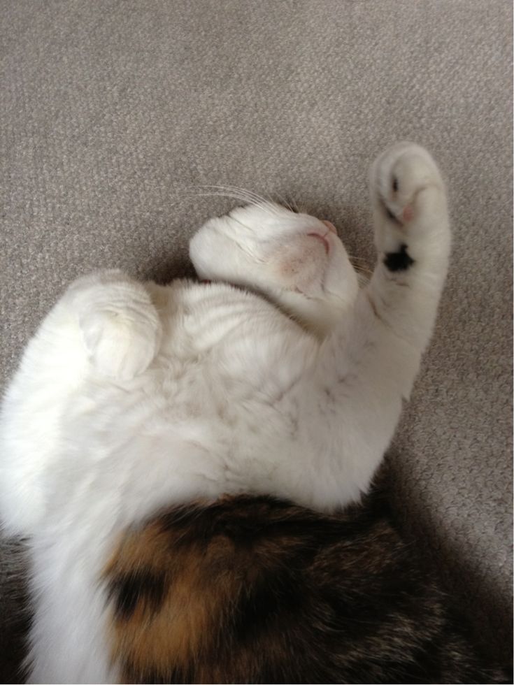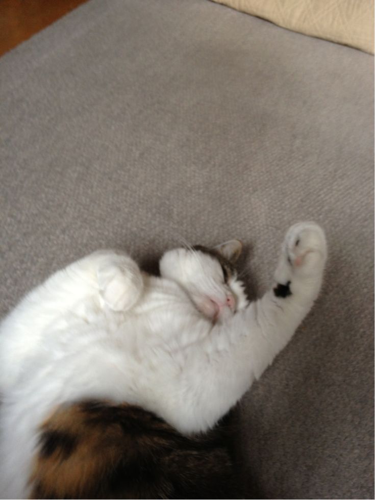 特徴:足が短い。鼻の頭がもこっとしている。モンペをはいているかのような後ろ足である。大また開きで寝る。時折DVになる。ピンポン♪が鳴ると(来客)ダッシュで飛び出し、お迎え役をしつつ、脱走の隙を狙う。